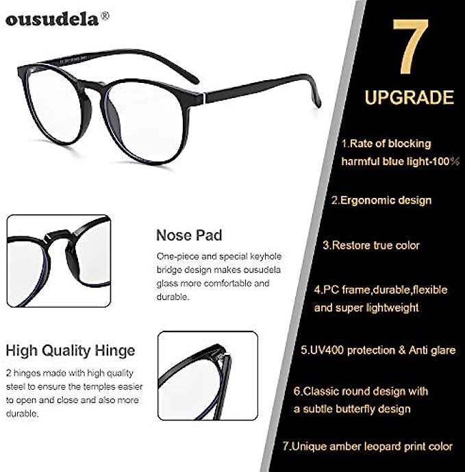 【Upgraded Material】Ousudela blue light glasses is made by upgraded material to reduce glasses weight and increase durability. Upgraded lens guarantee original and clear view of the glasses. UV400 function helps safe driving.
