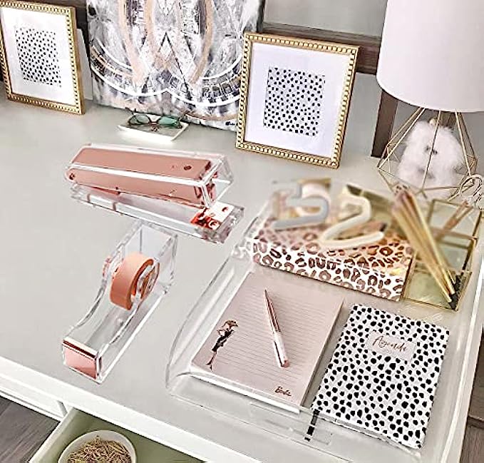 【DURABLE QUALITY】 High-end contemporary heavy duty acrylic and rose gold toned metal material, quality is better that usual plastic, translucent as glass, naturally elegant and beautiful, sturdy and durable office stationery set for daily use; Combining with both beauty and function, the well-designed tape dispenser is built to last.