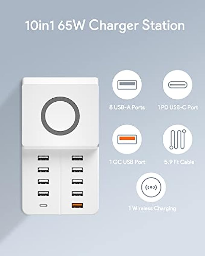 Charging Station for Multiple Devices - 10 Port Multi USB/PD/QC Charger Station with Wireless Charge Compatible with Cell Phone Tablets and More Electronics