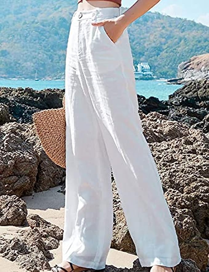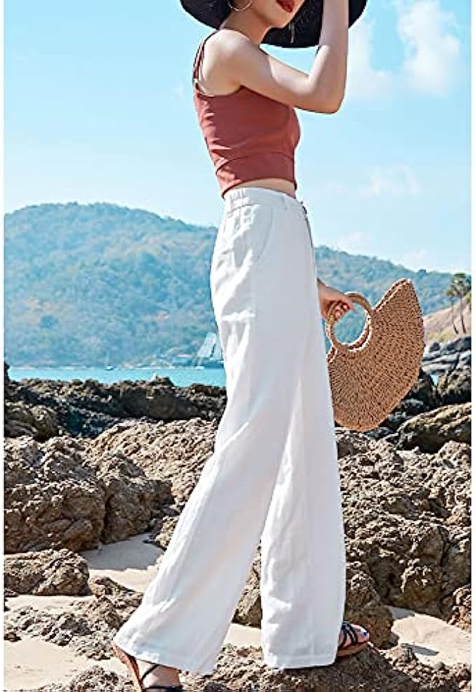 49% Rayon, 42% Polyester, 6% Nylon, 3% Spandex Imported Button closure Drape design, straight pattern Front button and back elastic, suitable for all shapes and sizes Fashion comfy solid high waist long pants, beach button down pants Suitable for any seasons date office school travel hiking and home Attention: The pants are more flowy drape and skin-friendly after washing, and the color may be slightly different due to the shooting light problem