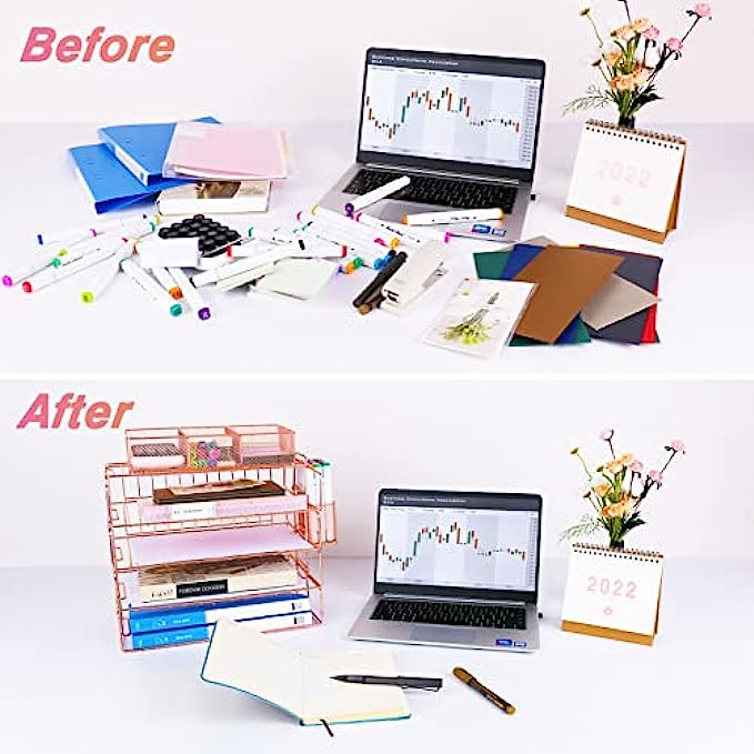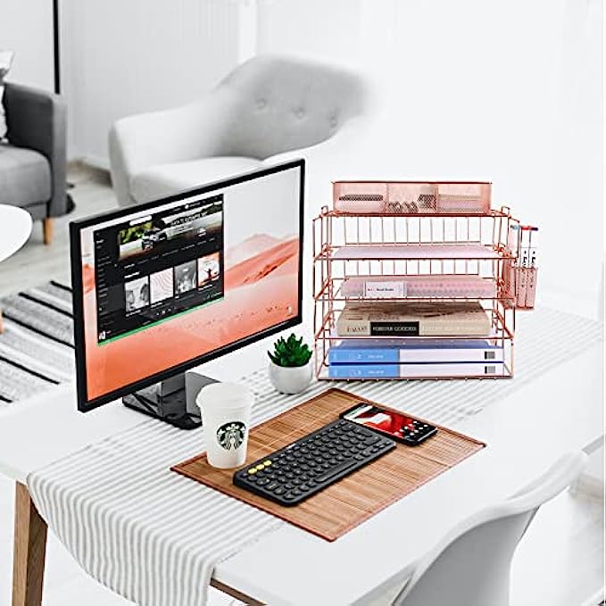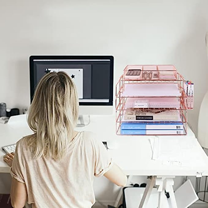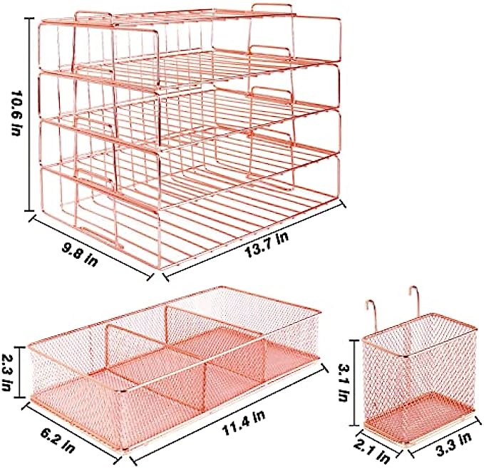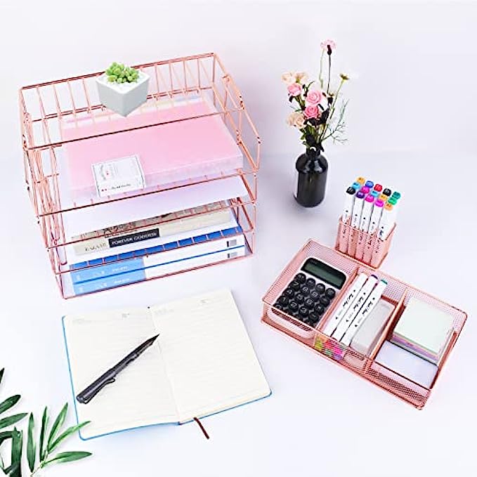【PRETTY ROSE GOLD DESKTOP ORGANIZER】 Gorgeous rose gold desk organizer, includes stackable 4 tier trays, 3 compartment mesh storage tray, pen holder. Perfect for holding Letter/A4 size paper, folders, stationary, mails desk accessories.