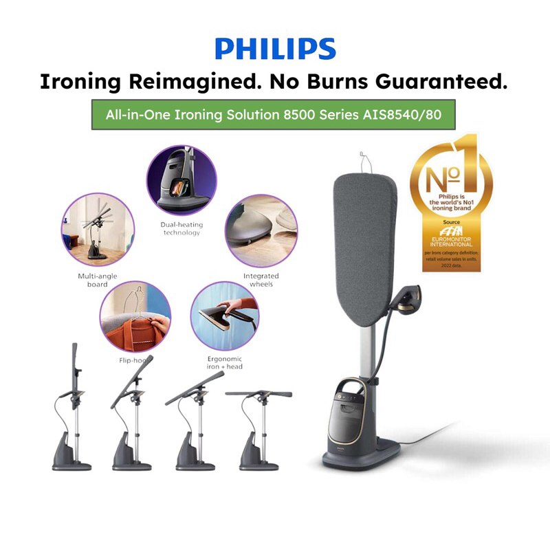 PHILIPS PREMIUM All-in-One Ironing Solution 8500 Series Stand Steamer AIS8540/80, 2200W, No Burns Guaranteed, Iron Head