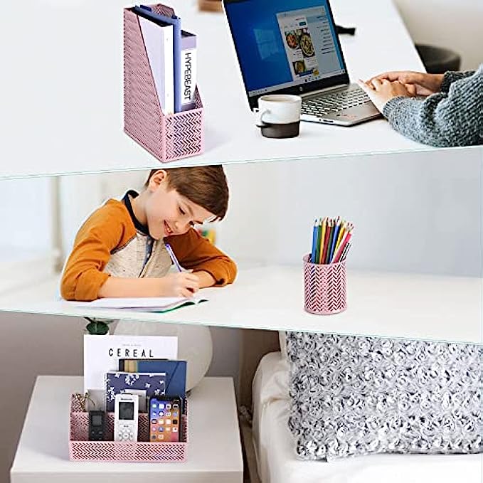 【Four Set Office Organziers Combination to Satisfy Your Needs】: You can store all your accessories with cute desktop organizers for office. One pencil cup, Letter Sorter, Magazine Holder and Paper Tray