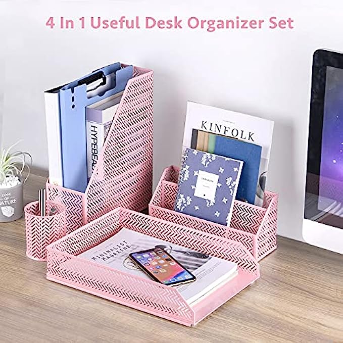 POPRUN Desk Organzier Set Cute Desk Accessories 4 Piece-Letter Sorter, Pen Cup, Magazine Holder and Paper Tray Office Organizer set - Cute Stationary Desktop Accessories for Women Desk Set- Pink