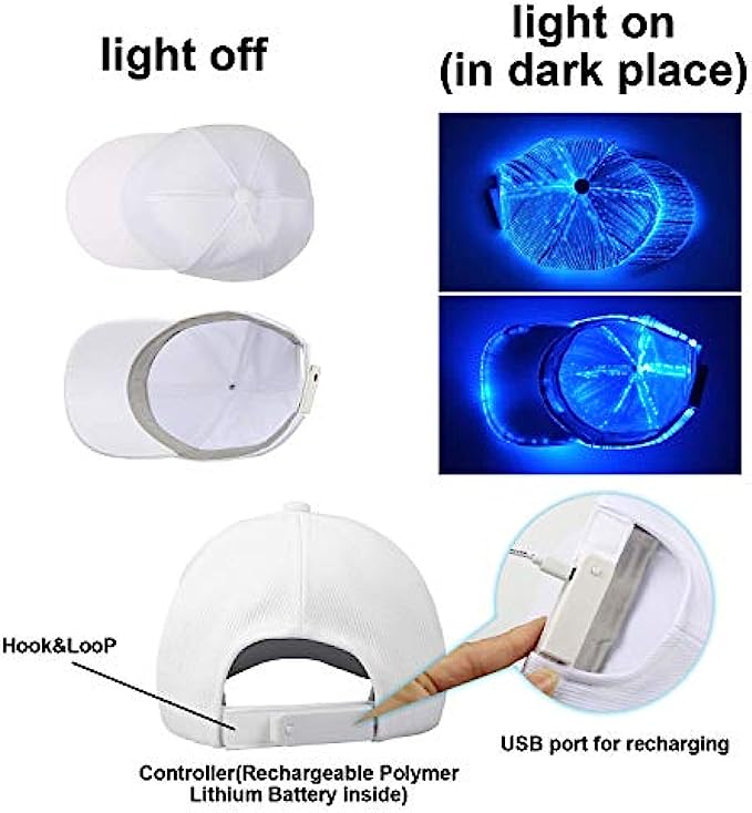 • 7 light up colors + 5 flashing modes: LED fiber optic hats light up in 7 colors( Red, Green, Blue, Gold, Light Blue, Purple, White); 5 Modes flcker - Monochrome, Flash, Gradual, Smooth, Polychromatic. The LED baseball cap is very beautiful for event/ party.