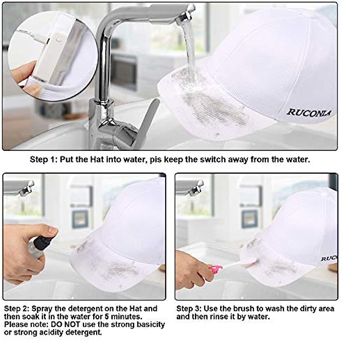 • The LED hat can be gently hand washed (scrub only, can not knead and twist ) with water up to 50 degree centigrade or natural soap, but the battery box must be taken off or keep away from water before washing. Please take off the battery box and please keep the plug of wire away from water. This fabric must not be washed in washing machine. Dryer or iron is forbidden.( Hang dry only).