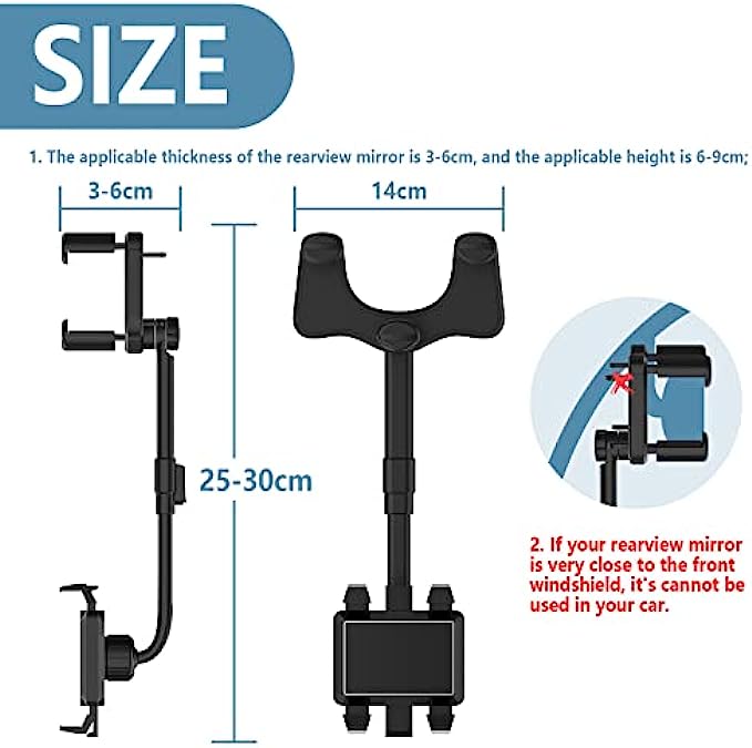 - 360-Please note: 1. The thickness of the rearview mirror is 3-6cm, and the height is 6-9cm; 2. If your rearview mirror is very close to the front windshield, it is not recommended that you buy it, otherwise it cannot be used in your car. degree rotation adjustment, you can always find the angle that suits you. - Thickened silicone pad, Vientiane roller, exquisite workmanship, light and durable. - Retractable and adjustable rods, which can be long or short, can be adjusted as needed, and can be retracted and hidden behind the rearview mirror, without affecting the vision of driving. - Driving navigation, live broadcast, video shooting, watch TV show, you can try it in any occasion where you need it.