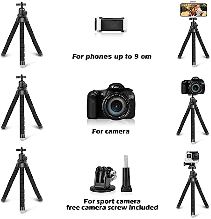 • 【Functional Accessories】 Comes with an upgraded universal phone holder (works for cellphones up to 5.23 inches wide, a wireless Bluetooth remote (compatible with most cell phones and controls up to 30 feet away). By a standard adapter screw thread, it is compatible with digital cameras and GoPro.