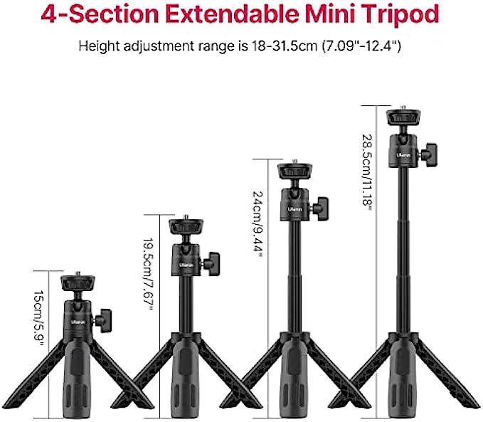 Compact and Portable Tripod: The mini tripod adopts 3-stage telescopic method, which can be extended to 18cm-31.5cm/7.08inch-12.4inch. The storage size is 18cm/7.08inch, and it only weighs 135g, making it easy to put in a bag