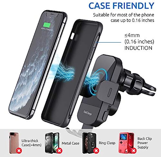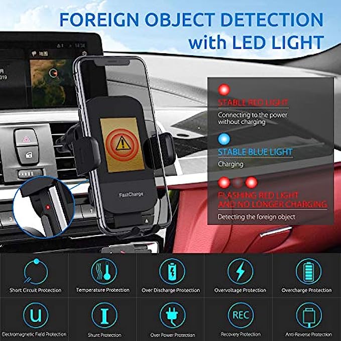 • 【FOREIGN OBJECT DETECTION with LED ALARM】When there is a metal substance between the wireless car charger mount and the phone, the car wireless charger will stop charging and the red light flashes to alarm. Effectively avoid the damage of the mobile phone caused by the high temperature of the metal