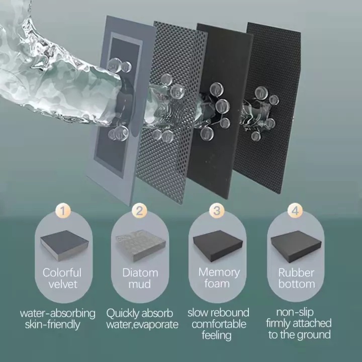 Appearance:Minimalist Quality:Excellent! Suitability:Excellent This is perfect for bathrooms! It’s thin, which allows opening of doors and it dries fast! Keeps the toilet dry!much better than the hard diatomaceous mats which blocks the door