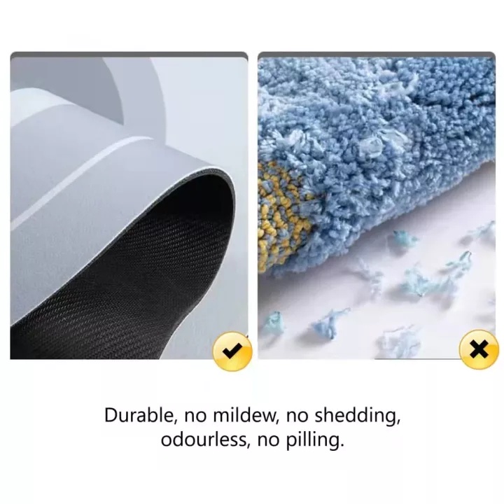 Appearance:cute Suitability:floor mat Quality:good Anti slip and good quality. Thickness just right, doesn't affect my door opening. If it gets too wet, need to hang dry, otherwise will remain damp. Cute design, cheerful.