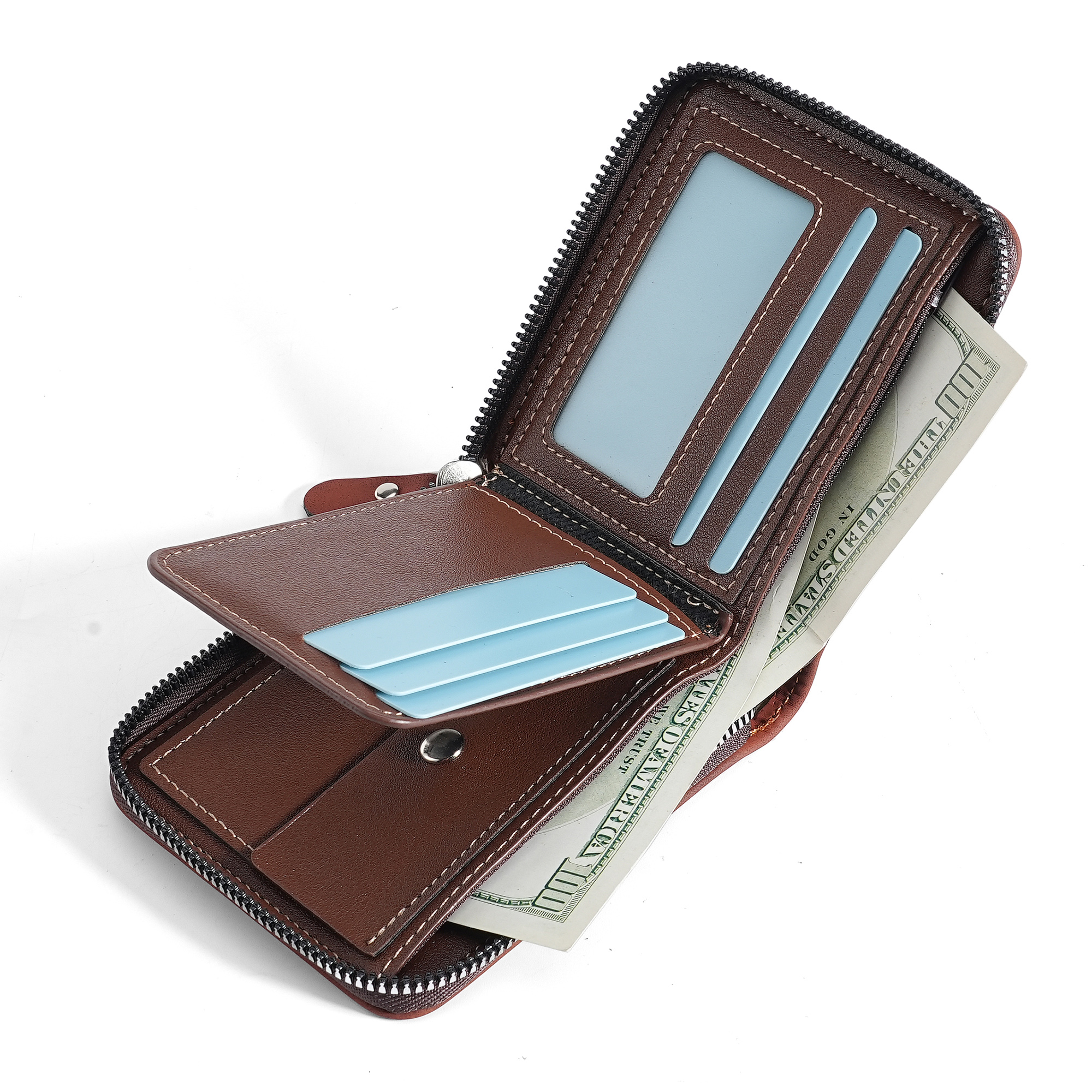 Color: blue Multi-compartment wallet can hold many things and has a coin pocket or small things or drops, the zipper is quite smooth and easy to pull.