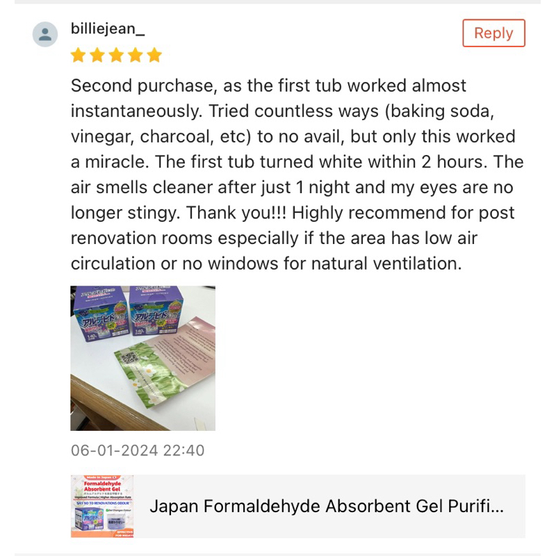 Super fastt delivery ! Product made in Japan! So fun to pour in the liquid , absorb all the 甲醛 as I just renovate my room! Excited to see the colour change. Smell wise is refreshing so I guess it act up like a air freshener gel too! Thank you seller