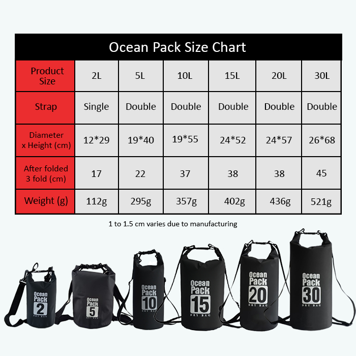 Performance:Not tested in wet environment. Quality:Great Appearance:Great Items looks great and well built small 5L is great for personal belongings. Big 30L is great for bringing extra clothes, towel and necessities for a day trip out, diving or just going out to sea.