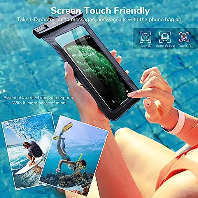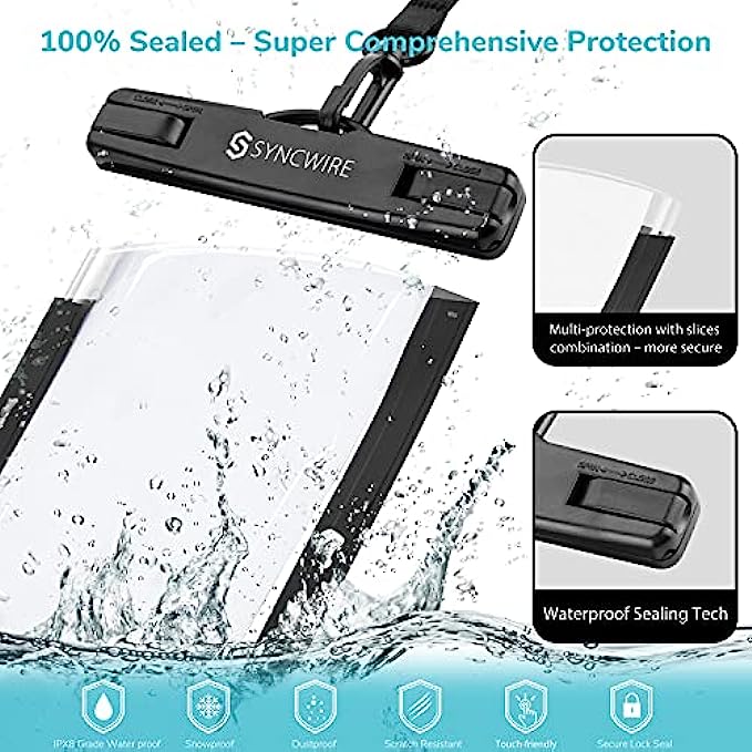 ?[Friendly Reminder]: This waterproof pouch is not recommended for mobile phones with thick cases (e.g., OtterBox). Please remove the thick phone case before placing the phone into the dry bag. The phone may be affected by hydraulic pressure at certain water depths, which will affect the operation of the touch screen. In this case, please press the volume button to take photos. Not applicable to touch ID and fingerprint unlocking. ?[IPX8 Waterproof]: With excellent waterproof seal performance (IPX8 rating), this 100% sealed waterproof bag provides comprehensive protection for devices in a variety of environments. The maximum waterproof protection is up to a water depth of 30 meters(100ft). Features include a simple snap and lock access which ensures a perfect seal, and keeps out water, snow, dust, sand, and dirt. ?[Wide Compatibility]: Syncwire dry bag is suitable for almost all cell phones up to 7 inches, such as iPhone 13/12/11 iPhone 13/12/11 Pro iPhone 13/12/11 Pro Max iPhone XS Max XR XS X 8 7 8P 7P 6s plus 6 plus se, Samsung Galaxy S22 S21 S10 S9, Google Pixel 6, etc. User-friendly design equips Syncwire waterproof phone case extra space for your card and cash, one case for all while no more wallet needed. ?♀️[Highly Sensitive Touch]: High-quality soft TPU material exclusively made for delicate touch and response. It ensures the normal use of a touch screen, camera and other functions in water (fingerprint unlocking is not supported). ?[Transparent and Portable Design]: With crystal clear windows on the front and back, this waterproof case is perfect for taking photos, videos and checking email. The adjustable and durable lanyard can hold at least 20kg and can be hung across the chest or slung across the waist for convenience. (Lanyard length: 60cm/23.6", Adjustable between: 40-60cm/15.7-23.6")