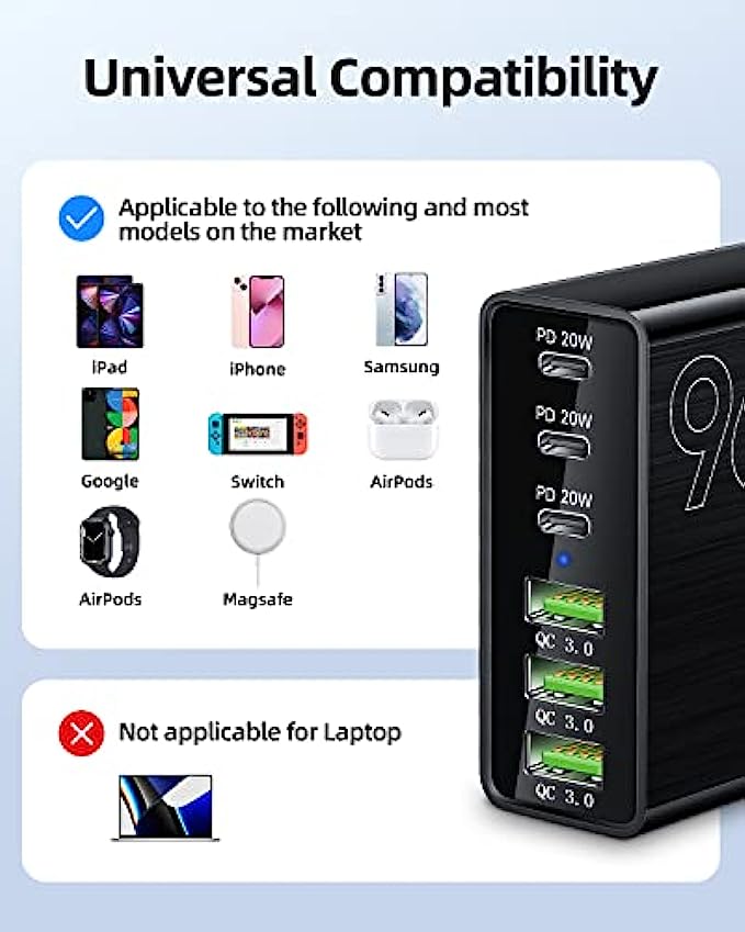 • 【6 IN 1Fast Charger】Our USB C Wall Charger With 3 USB-C Power Delivery port(each port 20W) and 3 USB-A port(each port 18W), you’re ready to charge six of your devices simultaneously. Automatically detect all connected devices, adjust the output accordingly, ensure a constant voltage to minimize charging time.